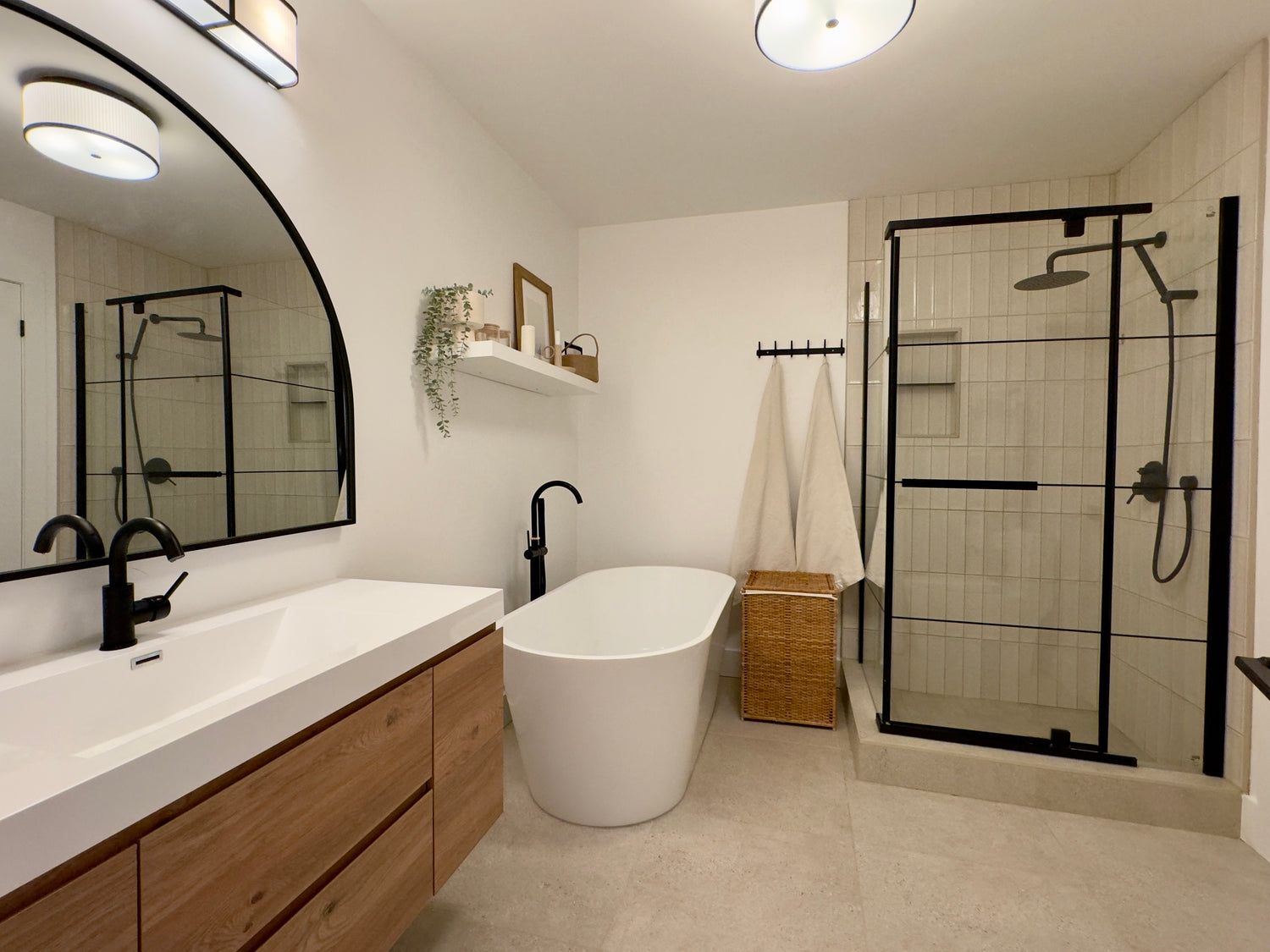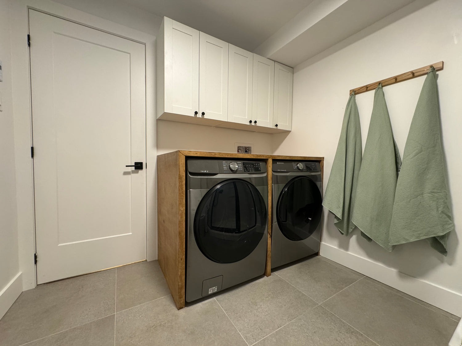 Jolie salle de bain avec un meuble sur mesure pour camoufler les électroménagers.